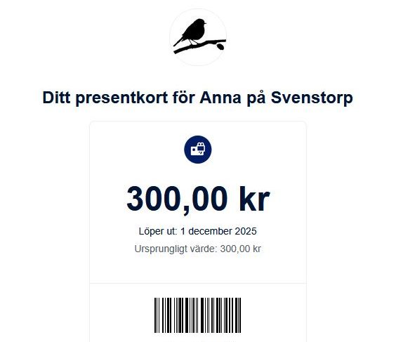 För att köpa ett digitalt presentkort skriver du till mig på annapasvenstorp@gmail.com och anger önskat belopp samt vilken mailadress jag ska skicka presentkortet till. Värdekod och kvitto skickas när betalningen av beloppet mottagits via swish till 0704-101329.